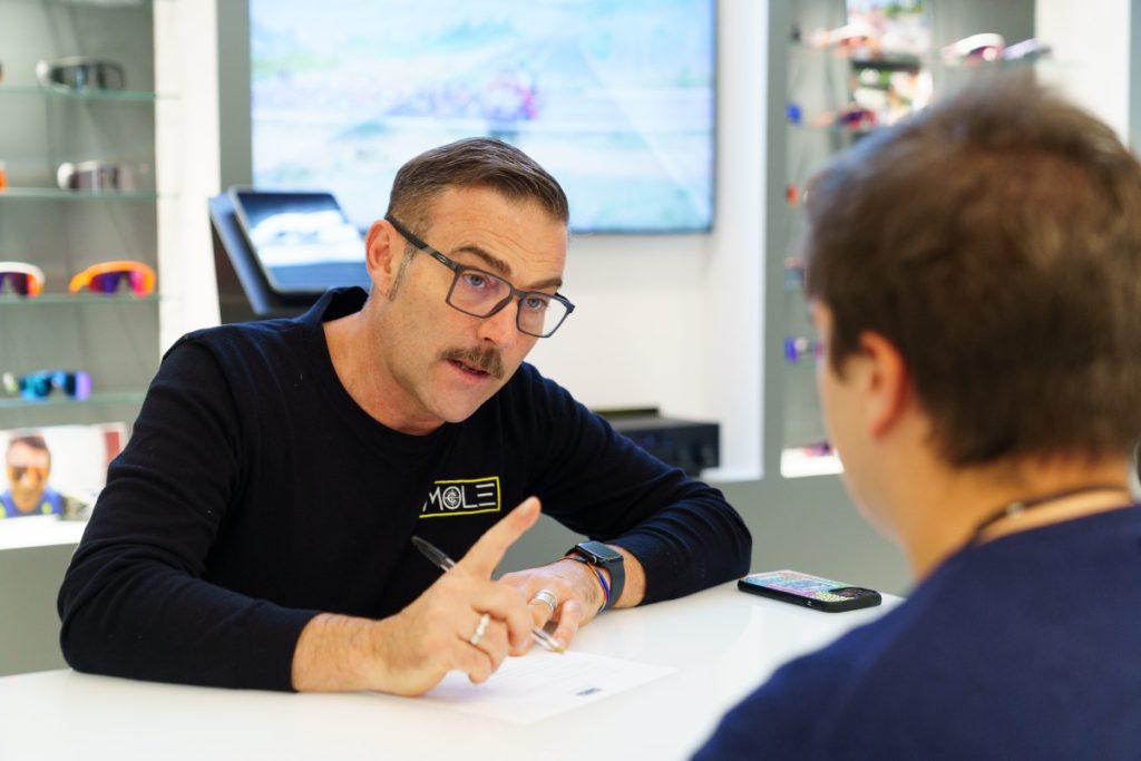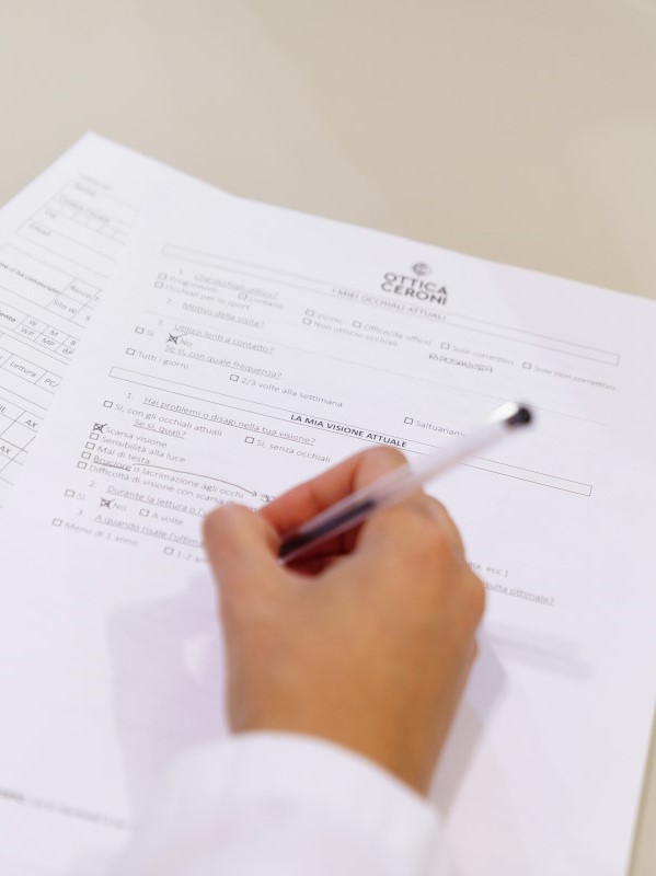 Successivamente, si acquisiscono informazioni tecniche sugli occhiali attualmente in uso e si compila un questionario dedicato per approfondire le abitudini visive, lo stato di salute, le esigenze lavorative e le passioni del cliente